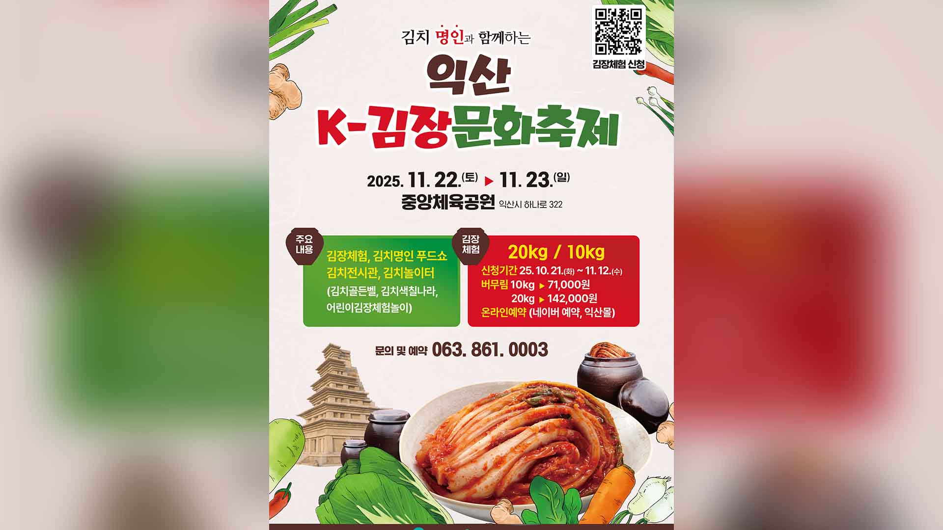 익산시는 오는 11월 22일부터 23일까지 중앙체육공원에서 '김치명인과 함께하는 K-김장문화축제'를 개최합니다.