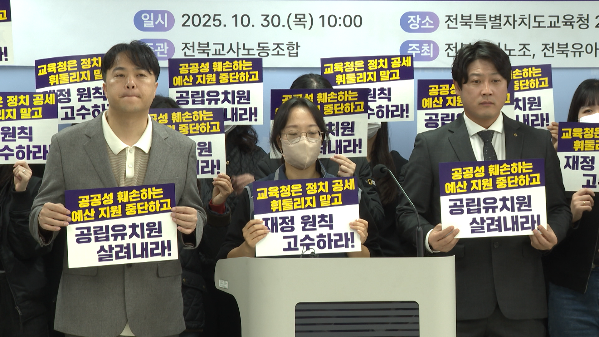 전북유아교육연대와 공립유치원 교사 80여 명은 오늘(30일) 전북교육청에서 기자회견을 열고, 정부의 사립유치원 추가 지원으로 교육청 자체 지원금을 표준학비에 맞게 조정한 것은 합리적 결정이라고 주장했습니다.