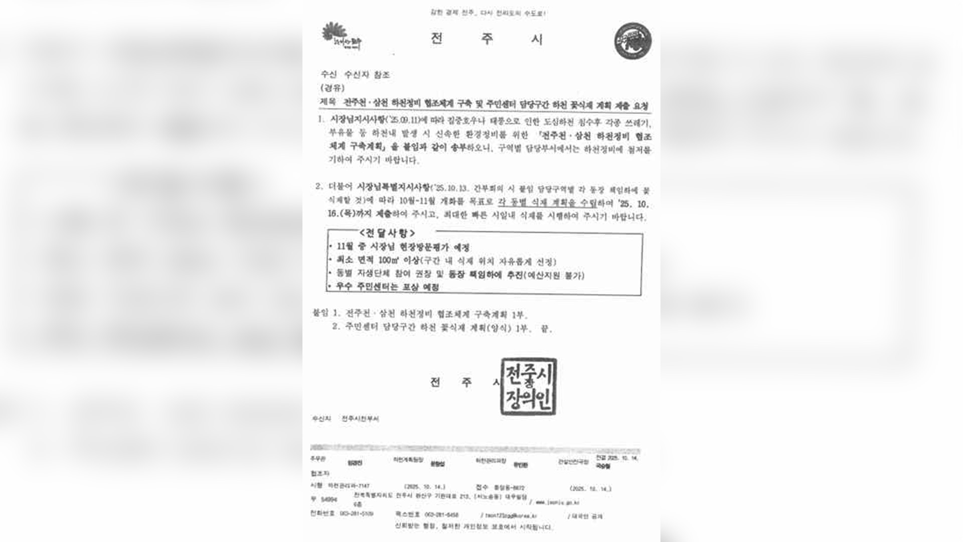 구체적인 사업 개요에는 11월에 꽃이 필 수 있어야 한다는 지침이 실려 있는데, 예산 지원은 불가하고, 향후 전주시장이 현장을 방문해 평가한다는 내용이 실려 있습니다.