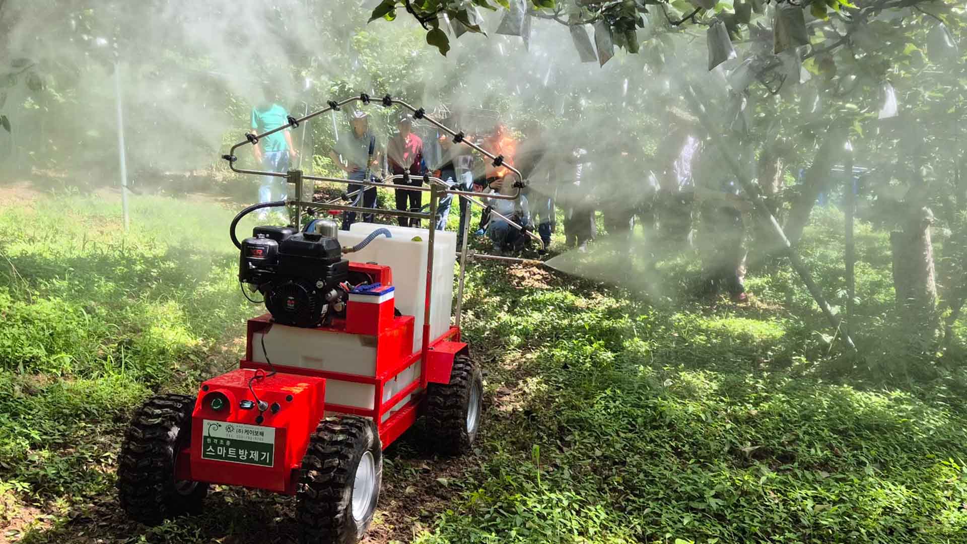 한국농업기술진흥원은 농수산대 홍순중 교수팀과 함께 장애물을 감지해 스스로 움직이며 과수를 관리하는 스마트 엽면시비기를 개발하고 과수원 현장을 돌며 실증작업을 벌이고 있습니다.