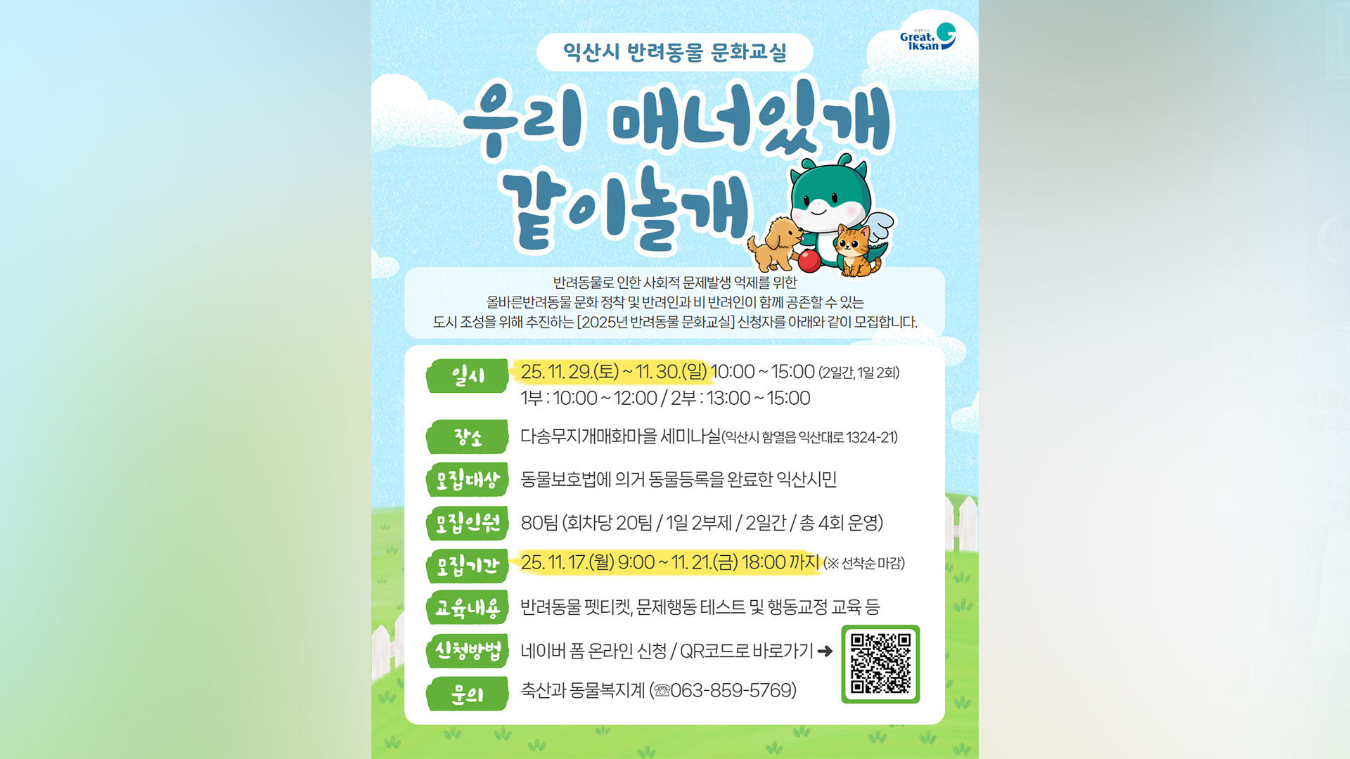 익산시가 올바른 반려동물 문화 확산을 위해 시민 대상 교육 프로그램을 운영합니다.