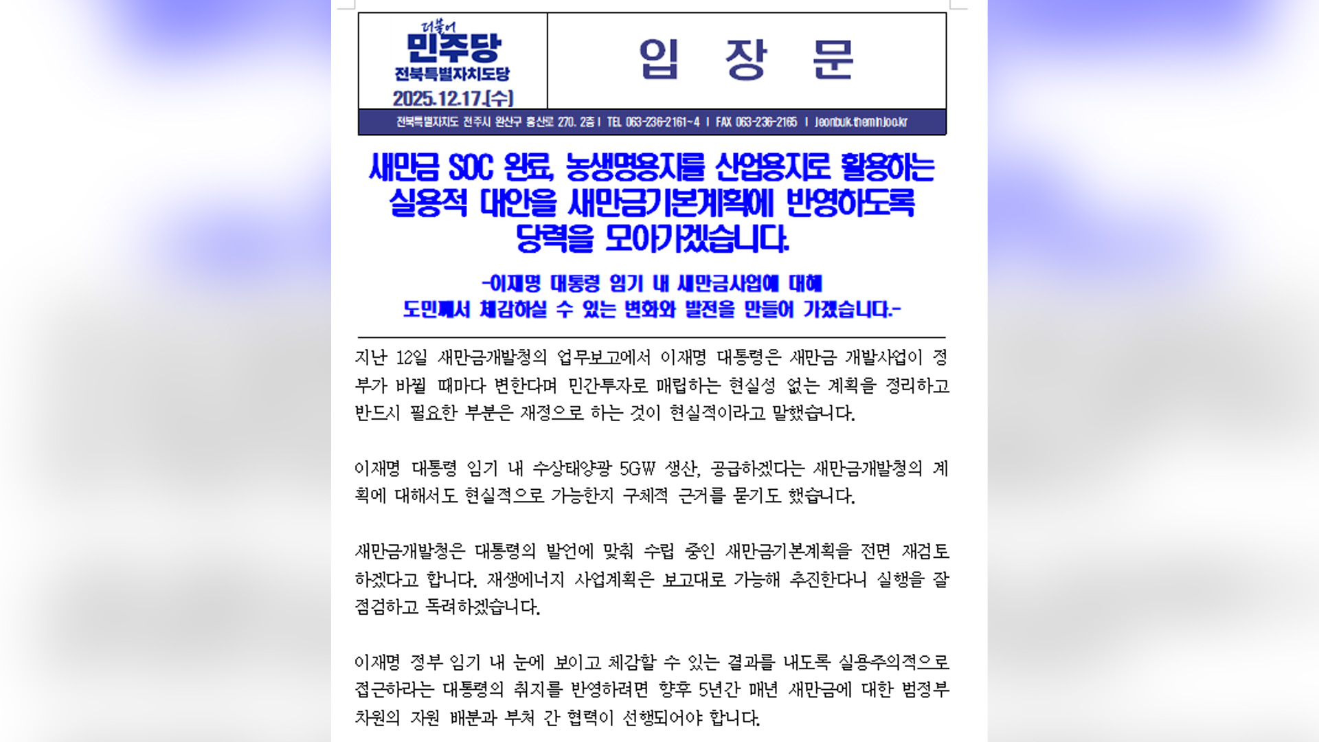 전북도당은 오늘(17일) 입장문을 통해 새만금 개발사업에 획기적인 재정 투입이 어렵고 현실성이 없다면, 도로·철도·항만·공항 등 핵심 기반시설 건립만큼은 흔들림 없이 추진돼야 한다고 강조했습니다.