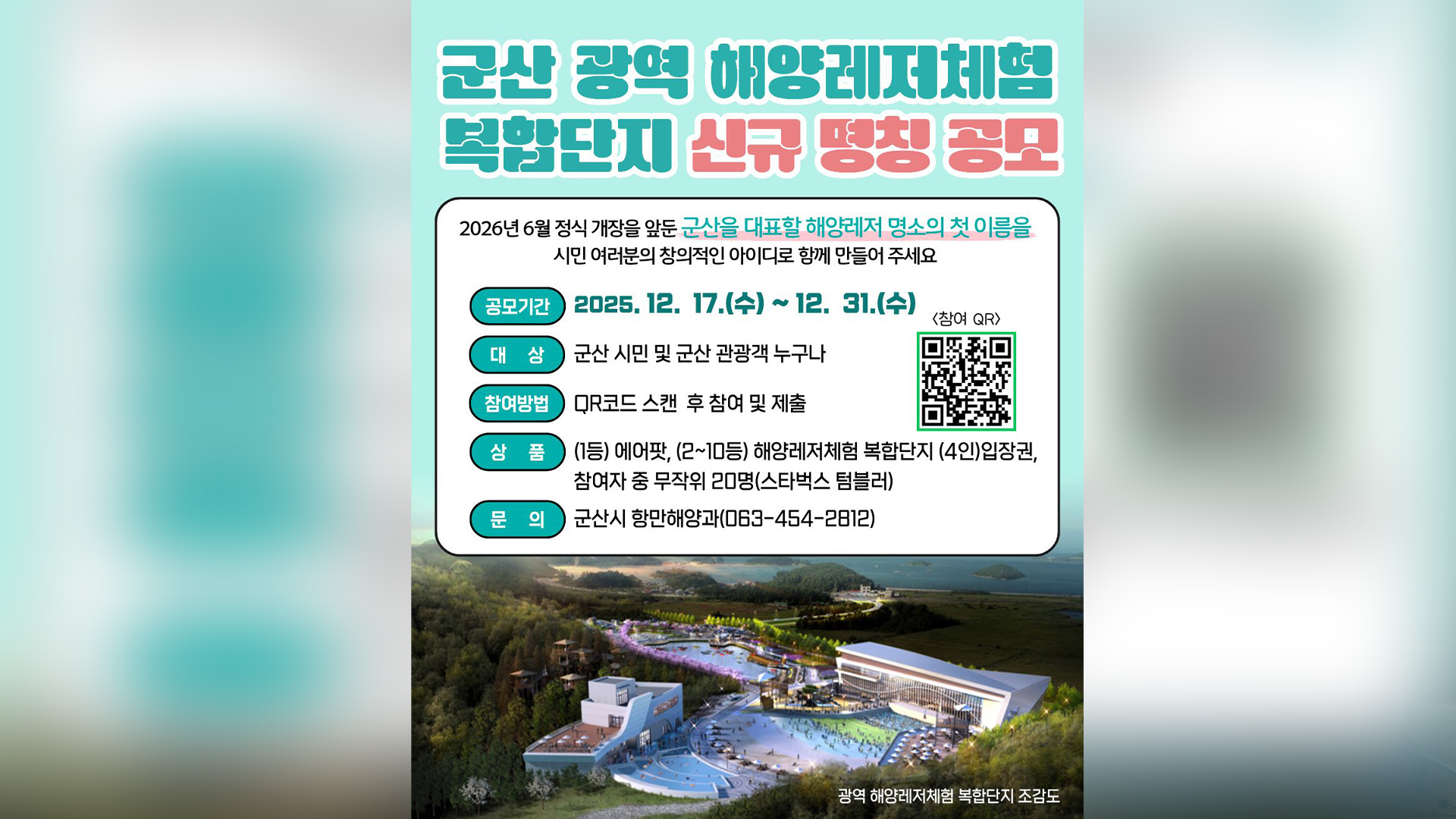 이번 공모는 시민과 관광객의 아이디어를 반영해 복합단지의 정체성과 지역성을 담은 이름을 선정하고, 군산 관광 브랜드 경쟁력을 높인다는 계획으로 이달 31일까지 진행됩니다.