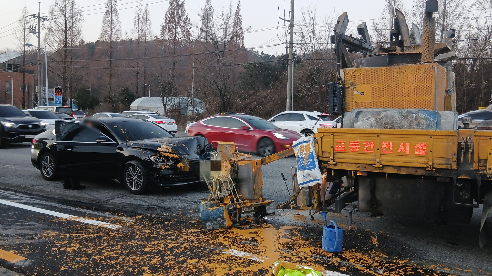 어제(17일) 오후 5시쯤 전주 상림동의 한 도로에서 승용차가 작업을 위해 멈춰 있던 2.5톤 노면 도색 차량을 들이받았습니다.