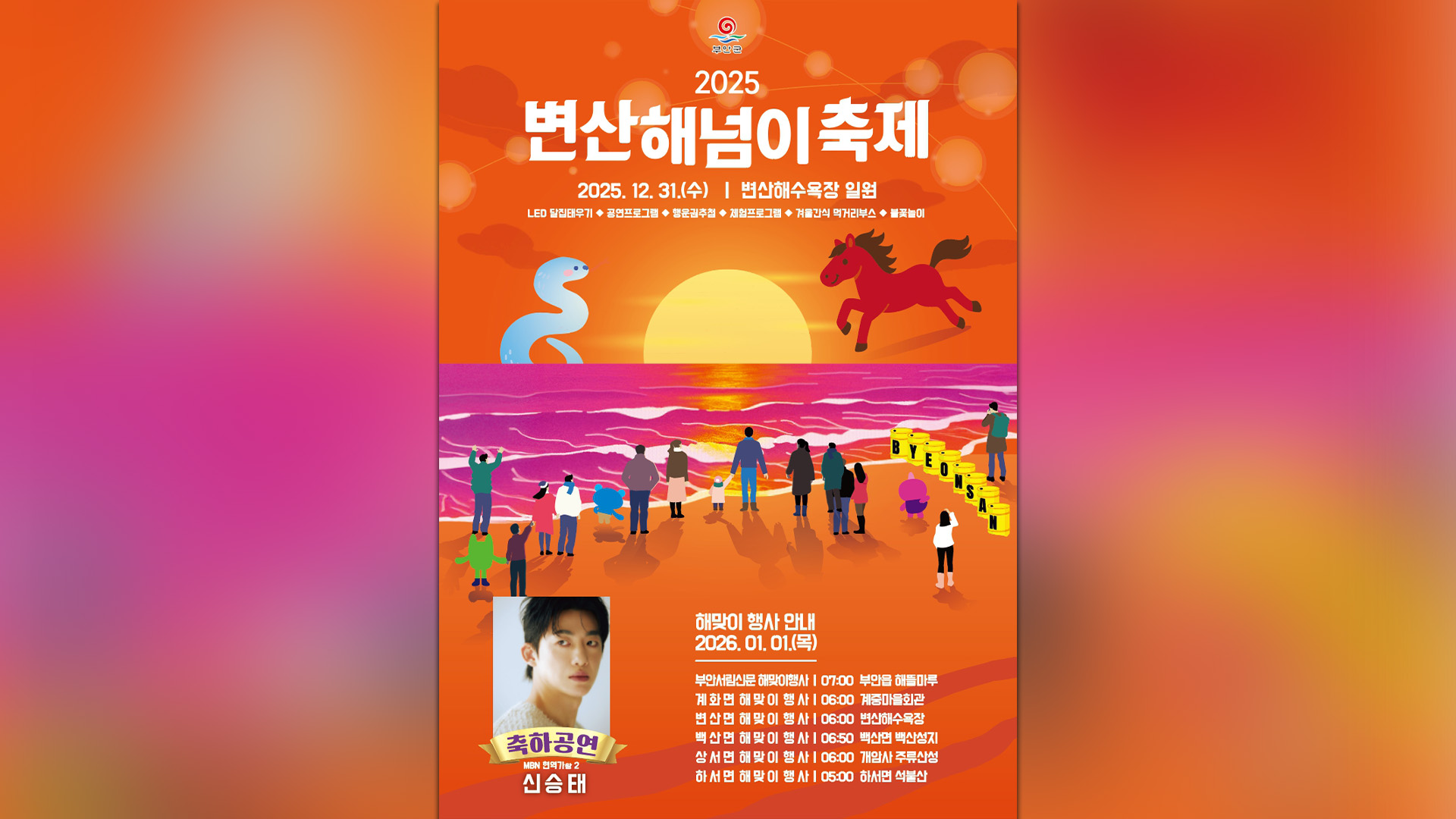 부안군은 오는 31일 서해안 대표 해넘이 명소인 변산해수욕장에서 '2025 변산 해넘이 축제'를 개최합니다.
