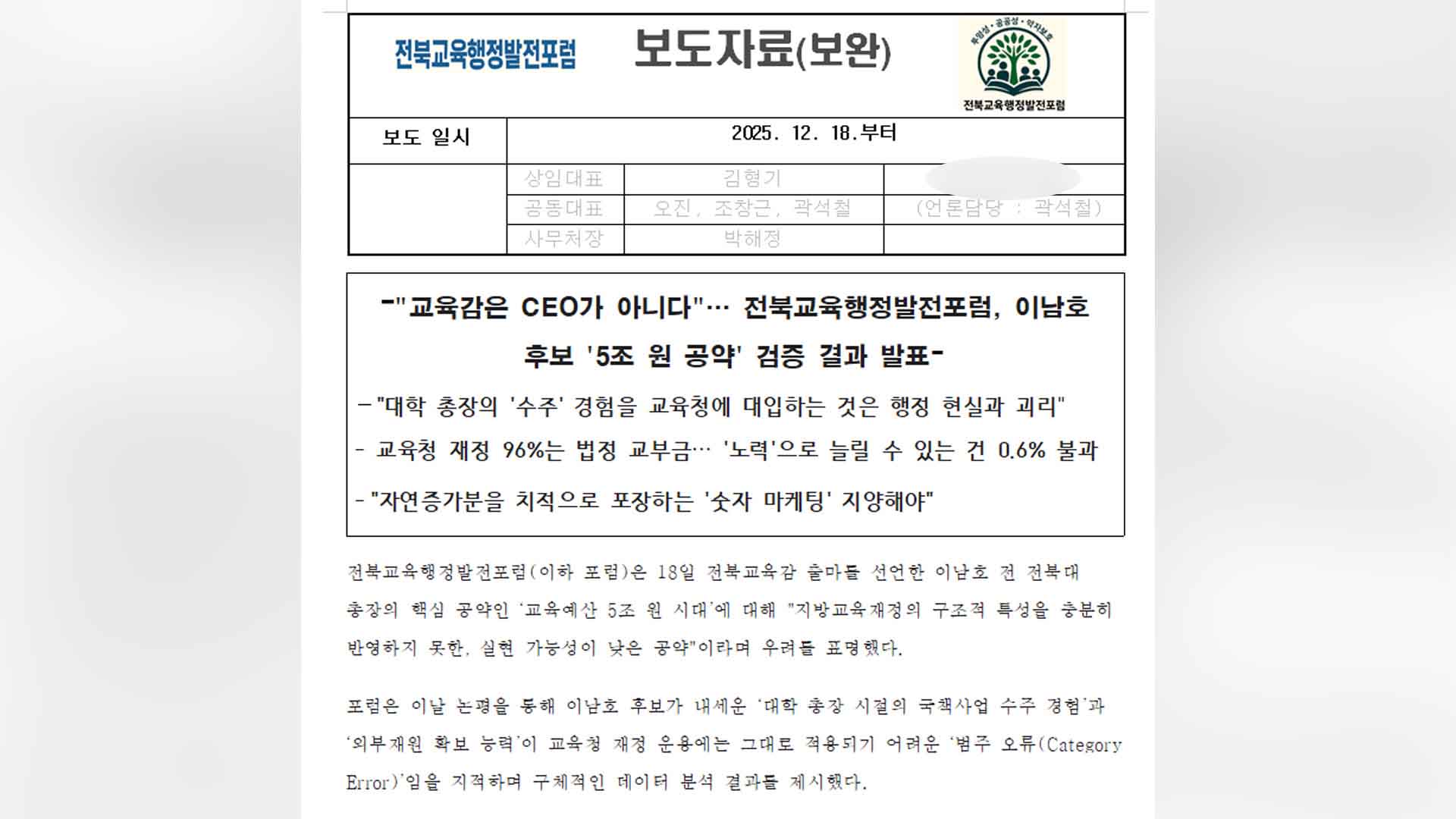 전북교육행정발전포럼은 이남호 전 전북대 총장의 핵심 공약인 '교육예산 5조원 시대'와 관련해 "지방교육재정의 구조적 특성을 충분히 반영하지 못한, 실현 가능성이 낮은 공약"이라고 지적했습니다.