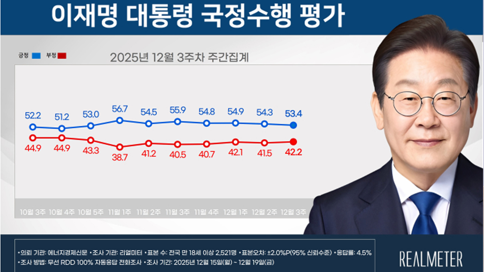 리얼미터가 에너지경제신문 의뢰로 지난 15부터 19일까지 전국 18세 이상 2,521명을 대상으로 조사한 결과에 따르면, 이 대통령의 국정수행을 긍정 평가한 응답자는 53.4%였습니다.