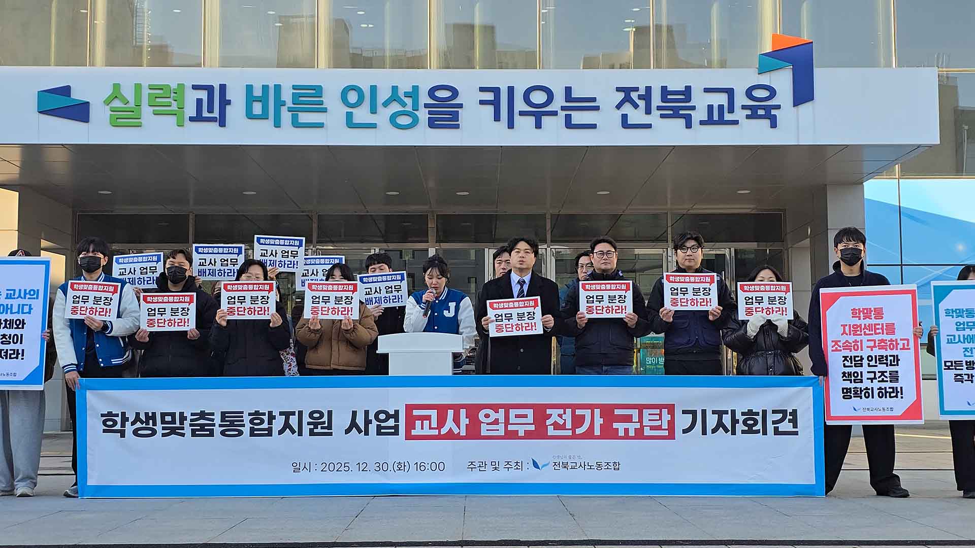 전북교사노조는 오늘(30) 전북교육청 앞에서 기자회견을 열고 해당 제도 도입으로 교육활동이 아닌 업무도 교사에게 전가될 가능성이 높다며 정책 재검토와 전담 인력 배치 등을 요구했습니다.