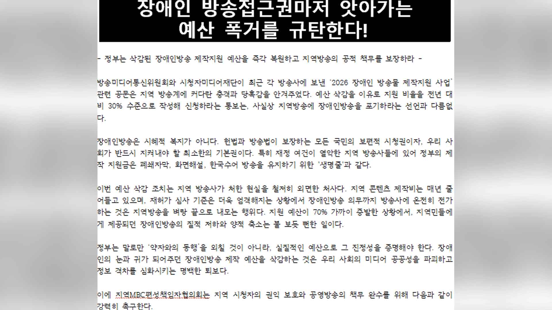 이를 두고 협의회는 지역 콘텐츠 제작비가 매년 줄어드는 상황에서 장애인 방송 지원 예산마저 70% 가까이 증발한다면 지역 방송은 장애인 방송을 포기하라는 선언과 다름 없다며 예산 복원을 촉구했습니다.