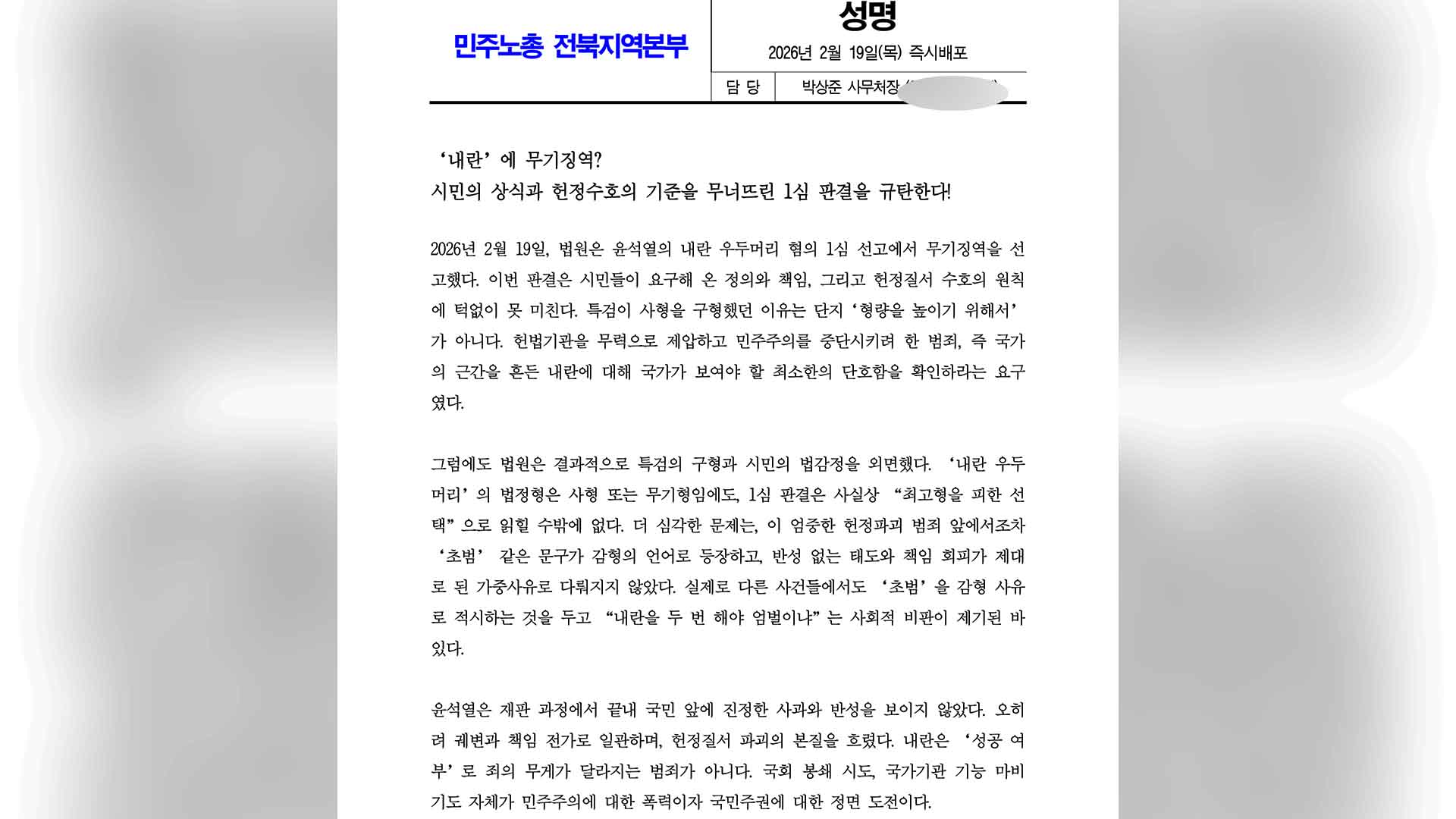 민주노총 전북지역본부는 이번 판결이 헌법기관을 무력으로 제압하려 한 중대 범죄의 무게를 충분히 반영하지 못했다며, '초범' 등의 표현이 감형 사유처럼 언급된 것은 시민 법감정과 헌정수호 원칙에 어긋난다고 비판했습니다.