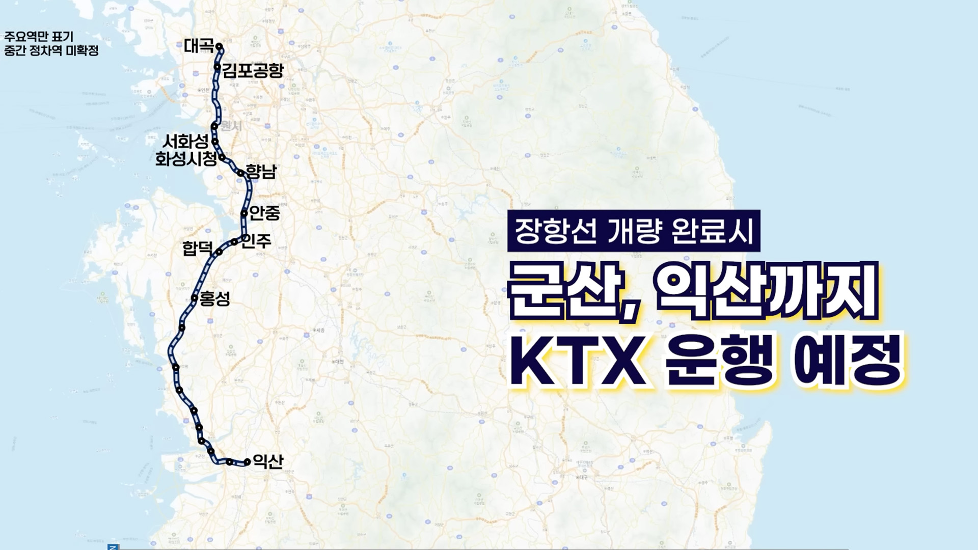 군산시 등에 따르면, 내년 말 홍성에서 대야까지 장항선 2단계 복선화 사업이 완료되면 서해선과 연계해 군산에서 김포공항, 고양 대곡역까지 준고속열차인 KTX-이음 노선이 다니게 될 것으로 전해졌습니다.