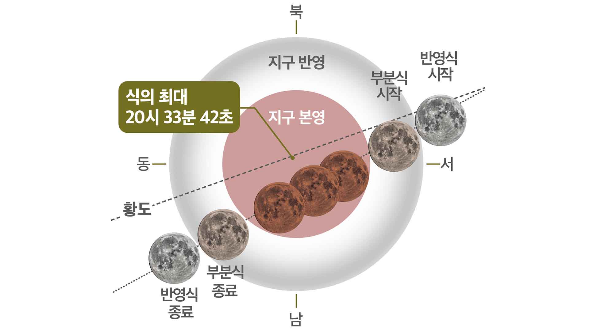 달이 지구 그림자에 완전히 가려지는 개기식은 오후 8시 4분 시작돼 30분 가까이 진행되고, 개기식 시작부터 약 1시간 동안은 어둡고 붉은 달을 볼 수 있을 전망입니다.