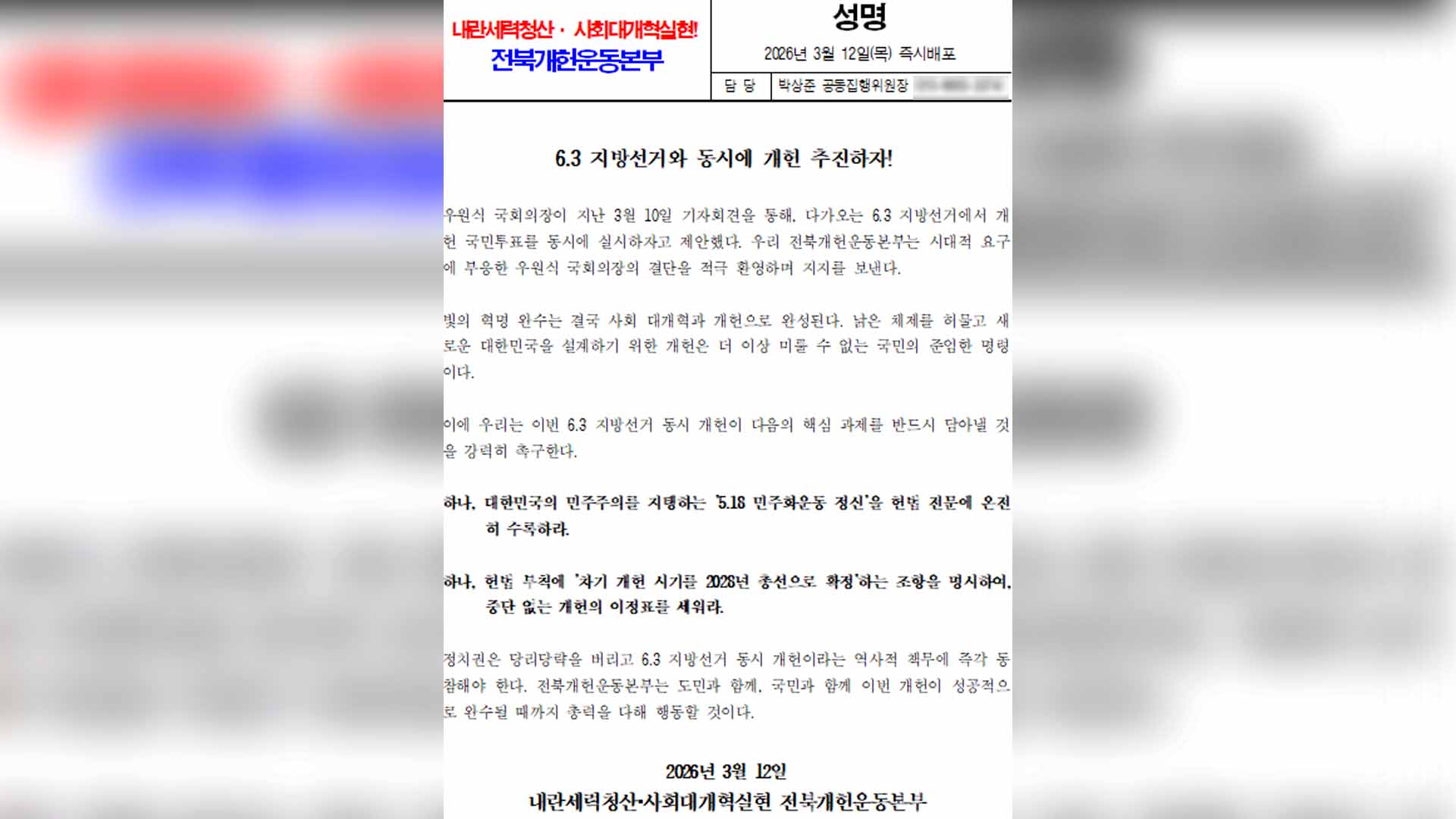 전북개헌운동본부는 오늘(12일) 성명을 내고, 대한민국의 낡은 체제를 허물어 사회를 개혁하기 위해 개헌을 더이상 미룰 수 없다며 정치권은 당리당략을 버리고 역사적 책무에 동참해야 한다고 밝혔습니다.