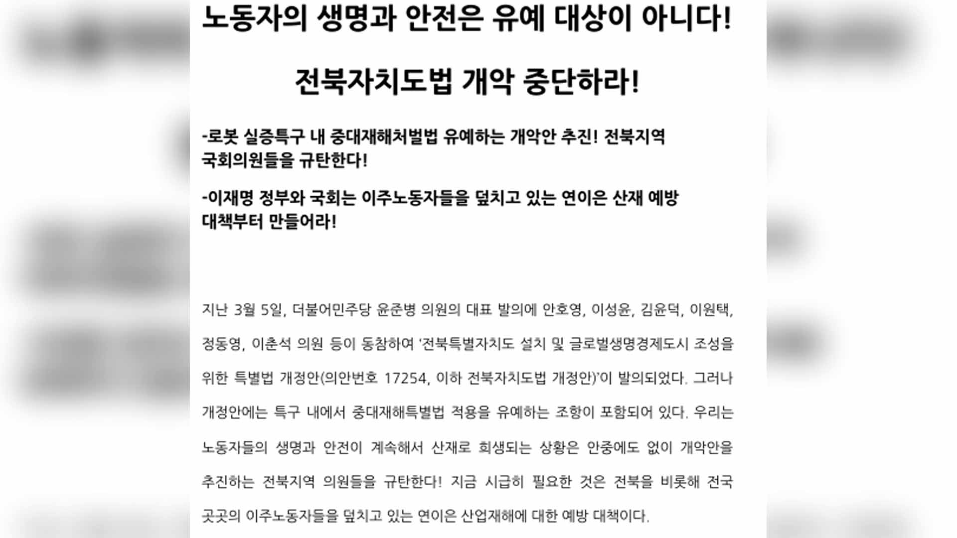 민주노총전북본부도 해당 개정안이 기술 실증과 산업 육성을 명분으로 안전 규제를 느슨하게 하고, 처벌은 뒤로 미루겠다는 의미라며 전북에 필요한 것은 기업 특혜가 아니라 산업재해 예방책이라고 비판했습니다.