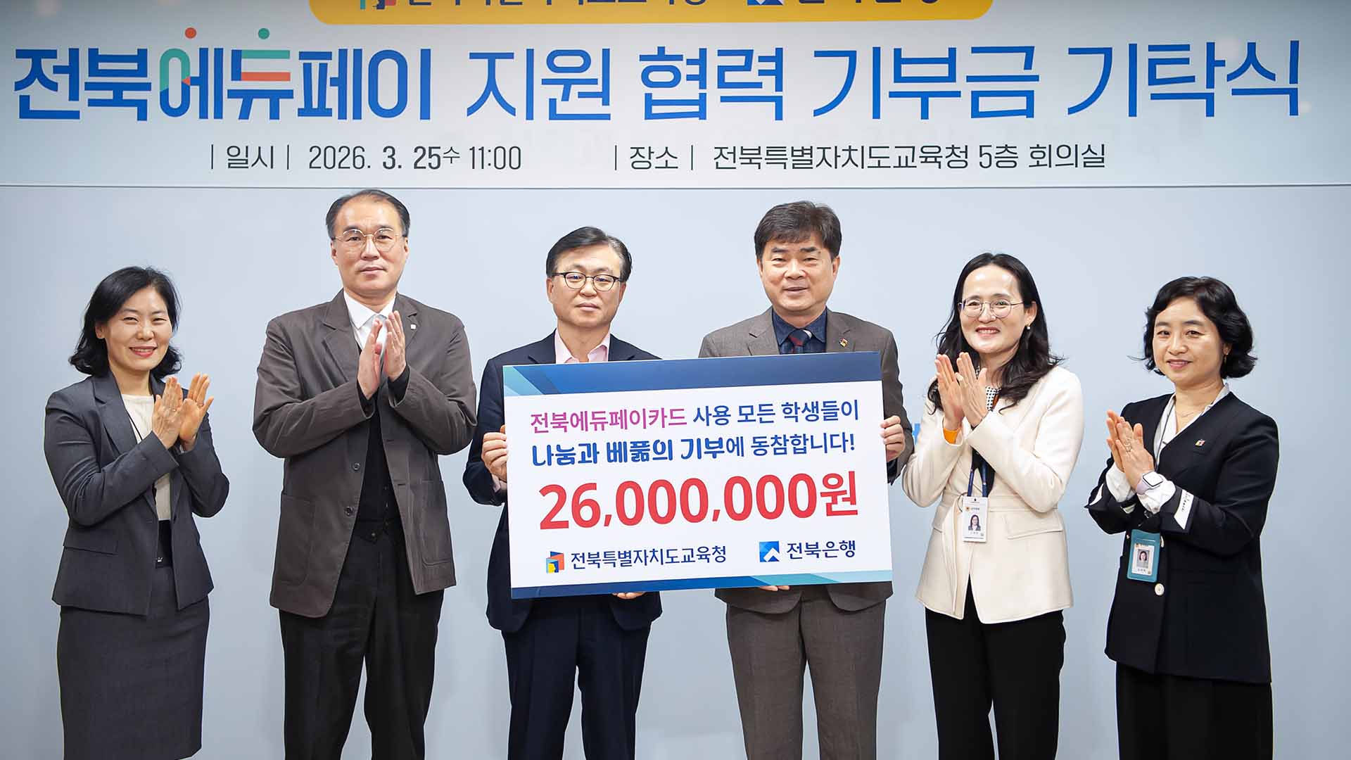 JB금융그룹 전북은행은 지난 25일 전북특별자치도교육청 5층 회의실에서 전북에듀페이 지원 협력사업 기부금 기탁식을 열고 카드 사용금액의 0.1%에 해당하는 2,600만원의 기부금을 학생 복지와 지역사회 공헌하는 취지로 기탁했습니다.