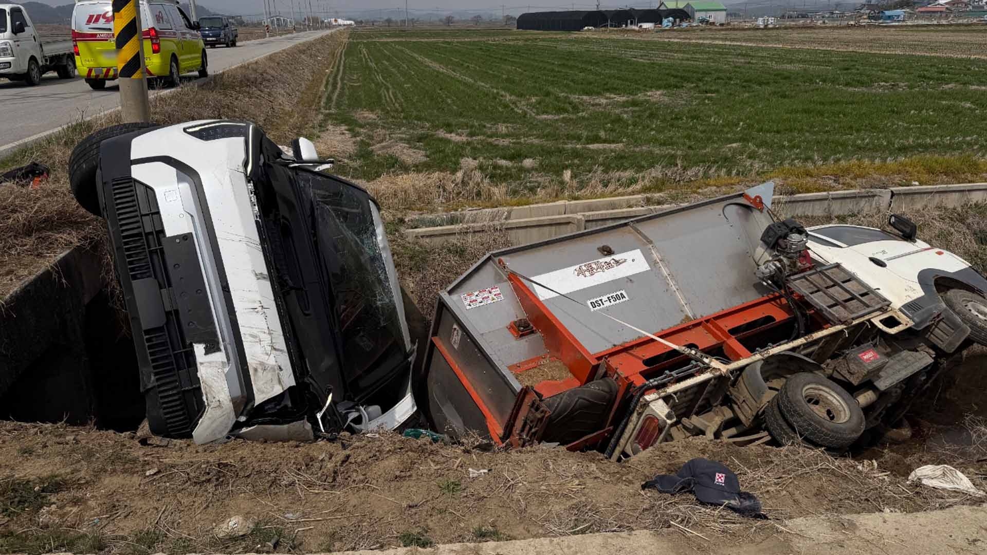 오늘(29일) 낮 11시 30분쯤 익산시 용안면의 한 농수로로 승용차와 1톤 트럭이 추락하는 사고가 발생했습니다.