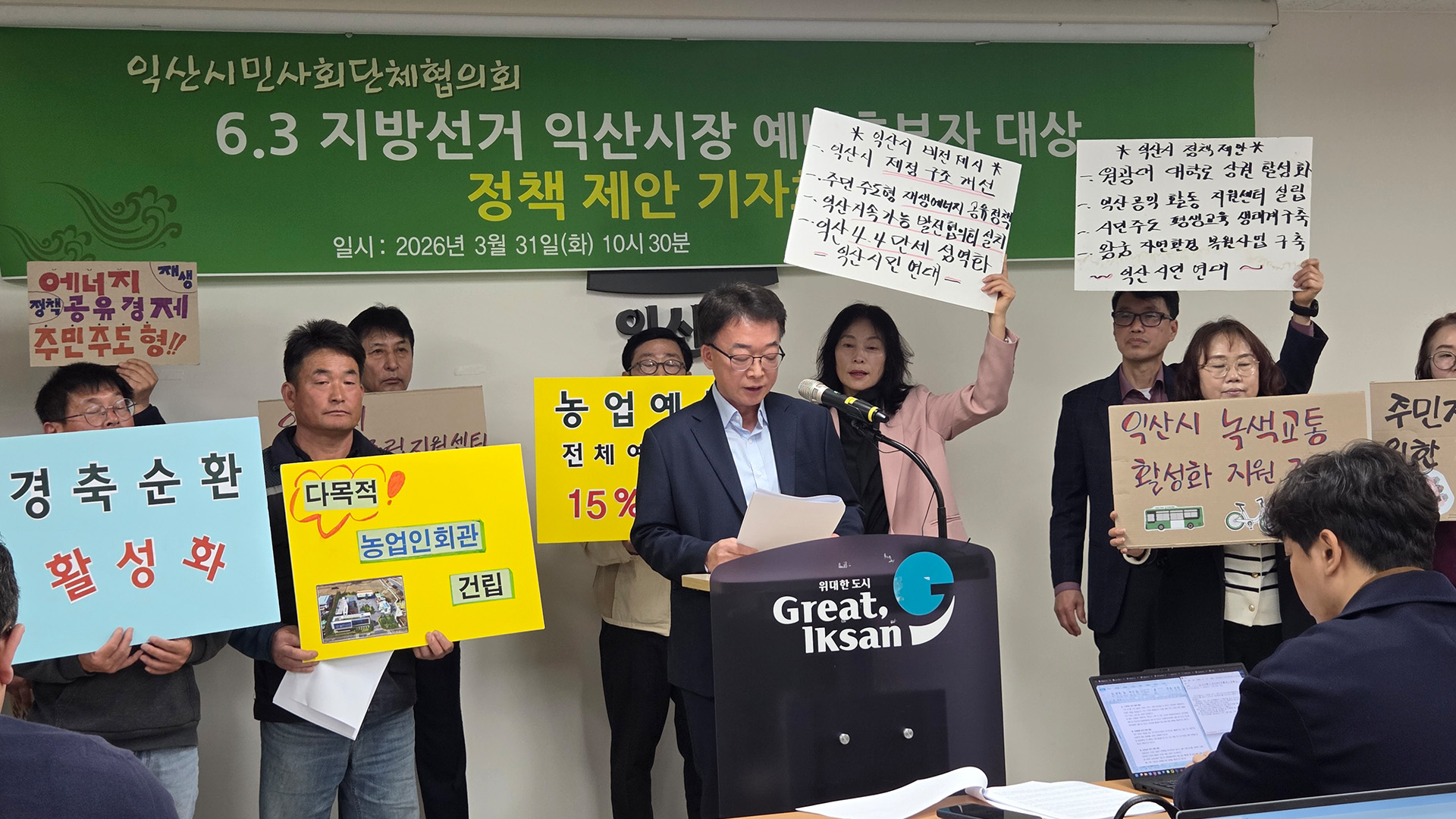 또 익산시 재정 구조 개선과 왕궁 자연환경 복원사업 거버넌스 구축, 전체 예산 대비 농업 예산 확대 등 16가지 정책을 제안했습니다.