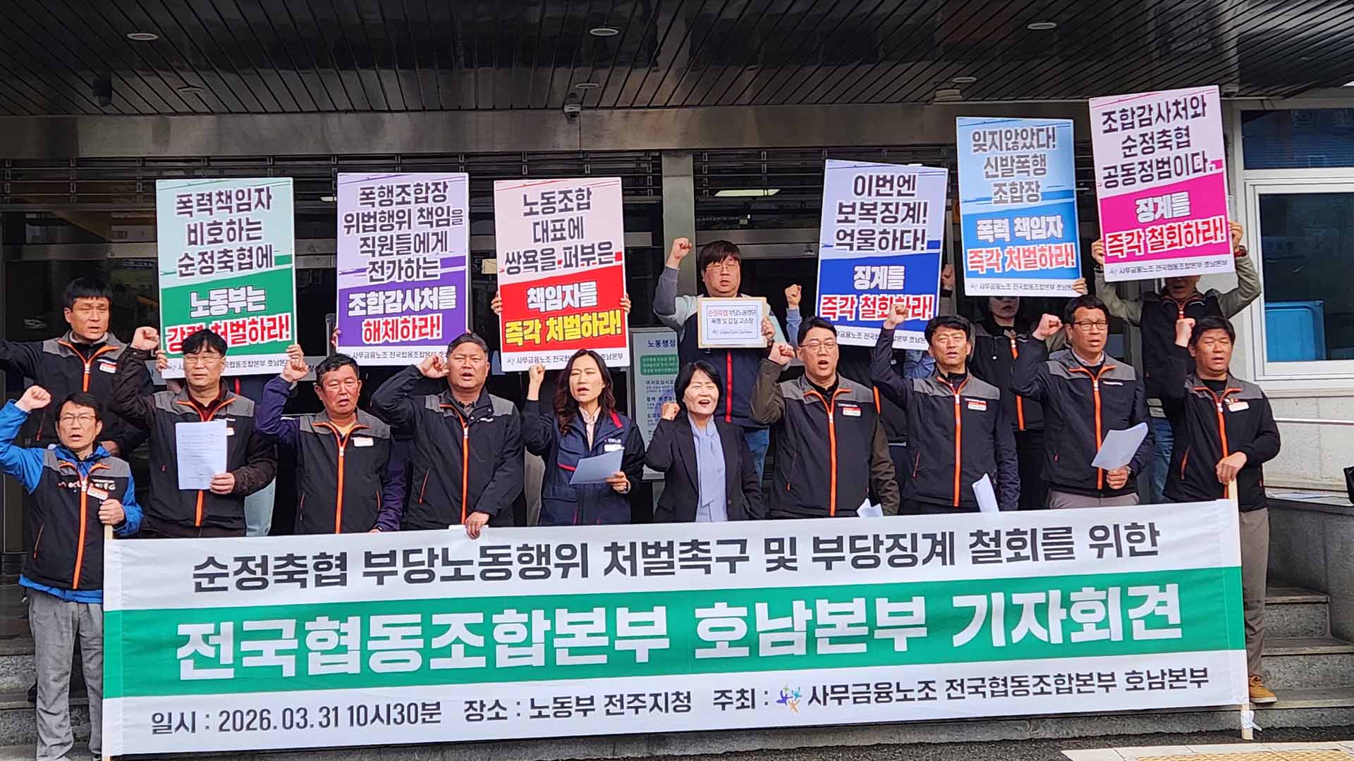 전국사무금융서비스노조 전국협동조합본부는 어제(31일) 고용노동부 전주지청 앞에서 기자회견을 열고, 순정축협 경영진의 갑질과 부당노동행위에 대한 수사와 처벌을 촉구했습니다.