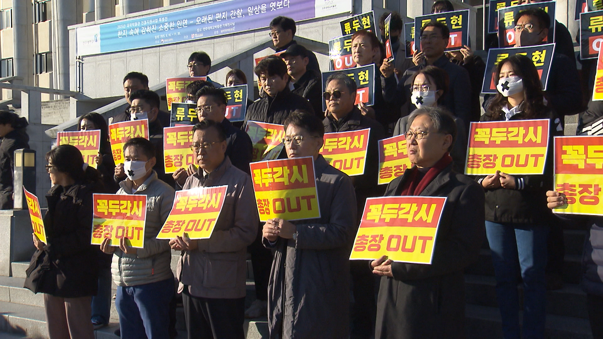 이사회와 갈등 중인 전주대 구성원들이 신임 총장의 출근 첫날부터 규탄 시위에 나섰습니다.전주대 비상대책위원회는 오늘(3일) 아침 본관 총장실 앞에서 시위를 하며, 신임 류두현 총장이 구성원들의 총장 선임 거부...