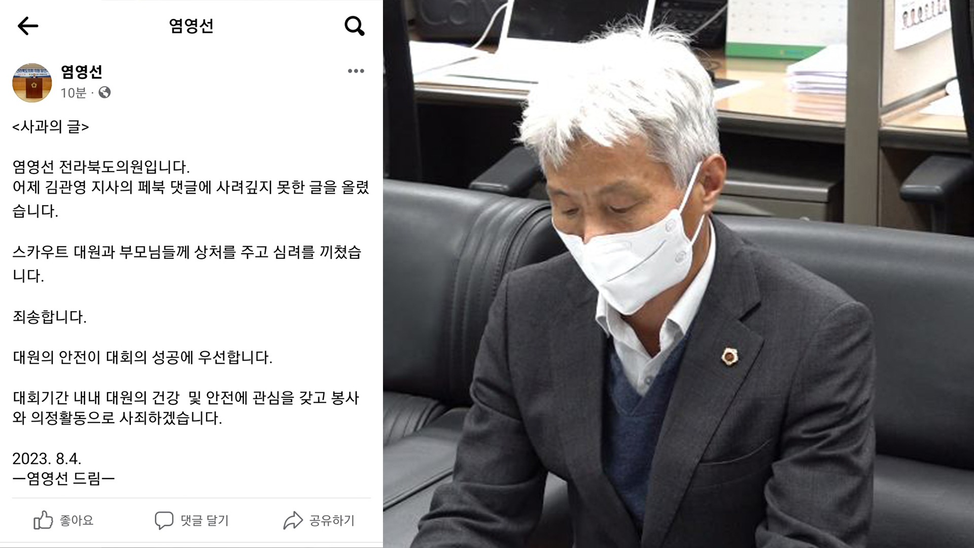 폭염으로 고통받는 스카우트 대원을 귀하게 자란 탓으로 치부해 논란이 된 전북도의원이 고개를 숙였습니다. 염영선 전북도의원은 페이스북을 통해 사려깊지 못한 글을 올려 스카우트 대원과 부모님들께 상처를 주고 심려...