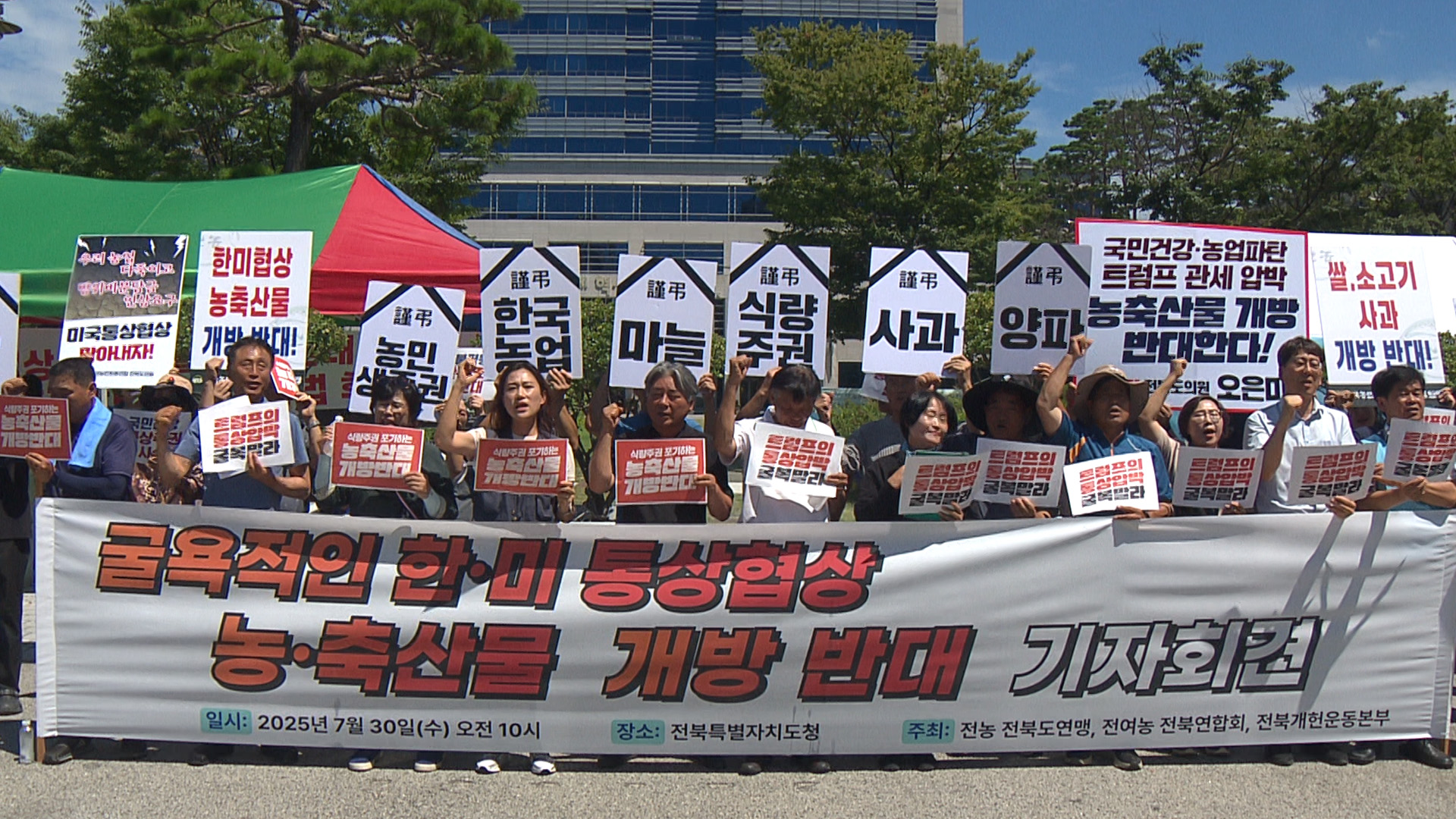전북 농민단체들이 오늘(30일) 기자회견을 열고, 미국의 농축산물 시장 개방 요구를 수용하려는 정부 기조를 강하게 비판했습니다.이들은 쌀과 소고기, 사과 등 추가 개방 움직임은 식량주권을 위협하고 농민을 죽이...