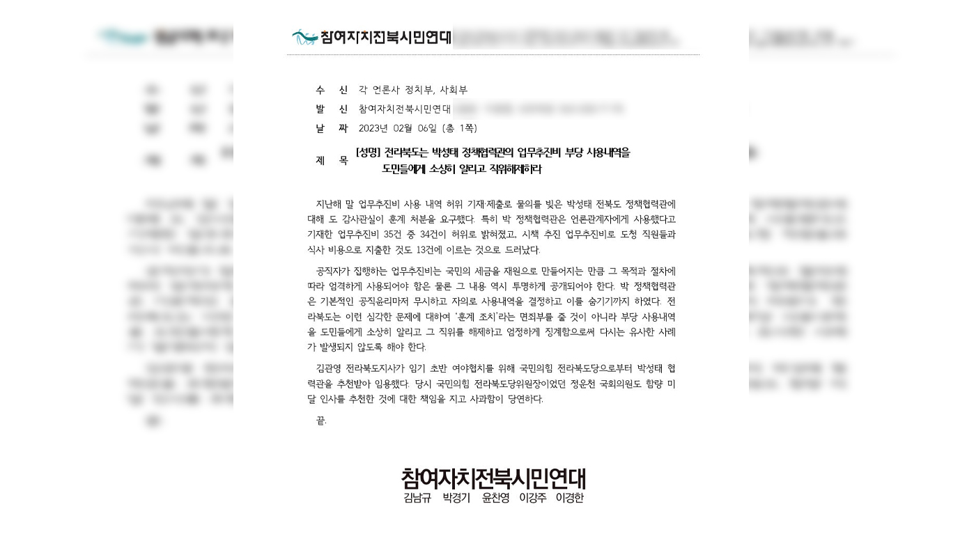 업무추진비를 부적정하게 사용한 박성태 전라북도 정책협력관을 직위해제 해야 한다는 요구가 나왔습니다. 참여자치 전북시민연대는 오늘(6일) 성명을 내고, 업무추진비 부정 사용에 대한 감사 결과로 박 협력관이 훈계...