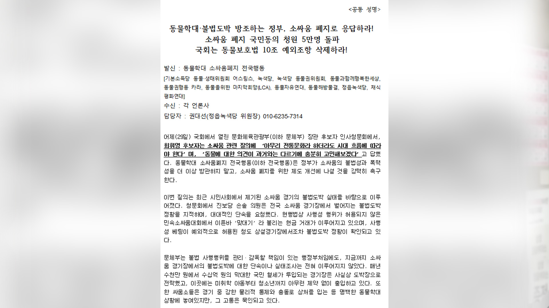 문화체육관광부 장관 인사청문회를 계기로 시민단체가 소싸움 폐지를 재차 촉구하고 나섰습니다. 정읍녹색당 등 동물학대 소싸움폐지 전국행동은 성명서를 내고, 현행법상 사행성 행위가 허용되지 않은 민속소싸움대회에서 ...