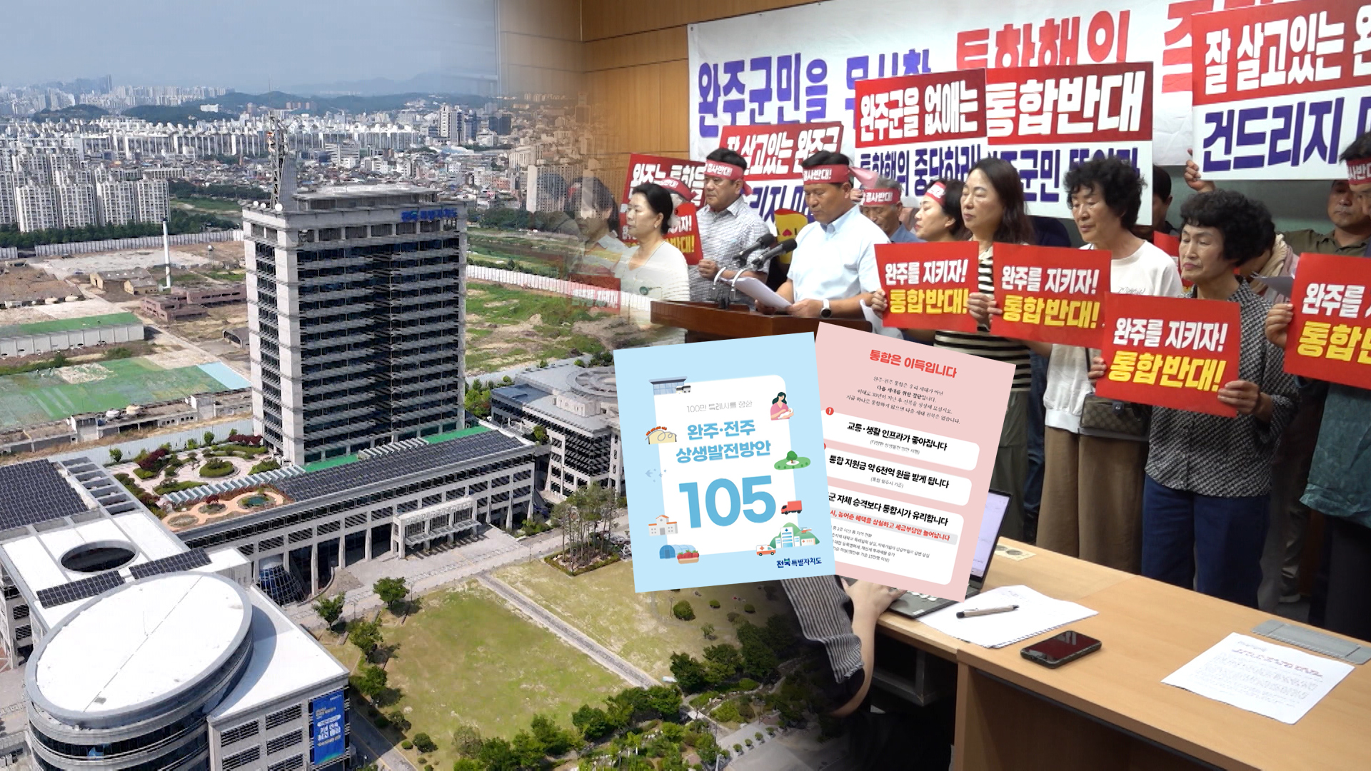 ◀앵커▶'완주군과 전주시가 통합하면 6천억 원이 생길 수 있다.'최근 완주 지역 주민들 앞으로 발송된 홍보물 내용인데, 모두 행정통합에 대한 장밋빛 청사진들로 채워져 있습니다.전북도가 배포한 건데, 통합을 둘...