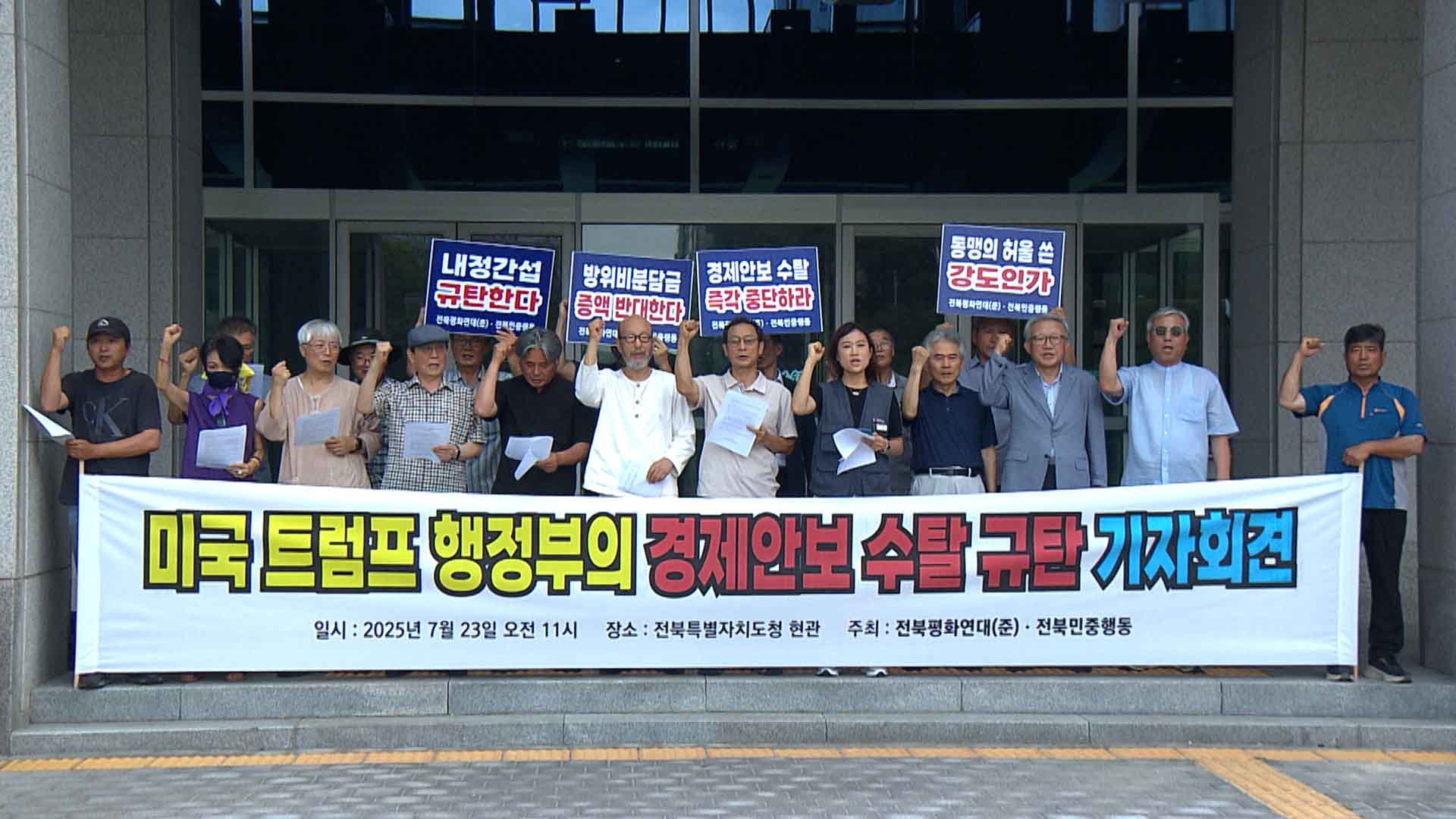 방위비 증액 등 압박을 이어가는 미국 트럼프 정부에 대한 규탄이 지역에서도 이어졌습니다.전북평화연대 준비위는 오늘(23일) 전북도청 앞에서 기자회견을 열고 트럼프 행정부가 상호관세 부과에 13조가 넘는 주한미...