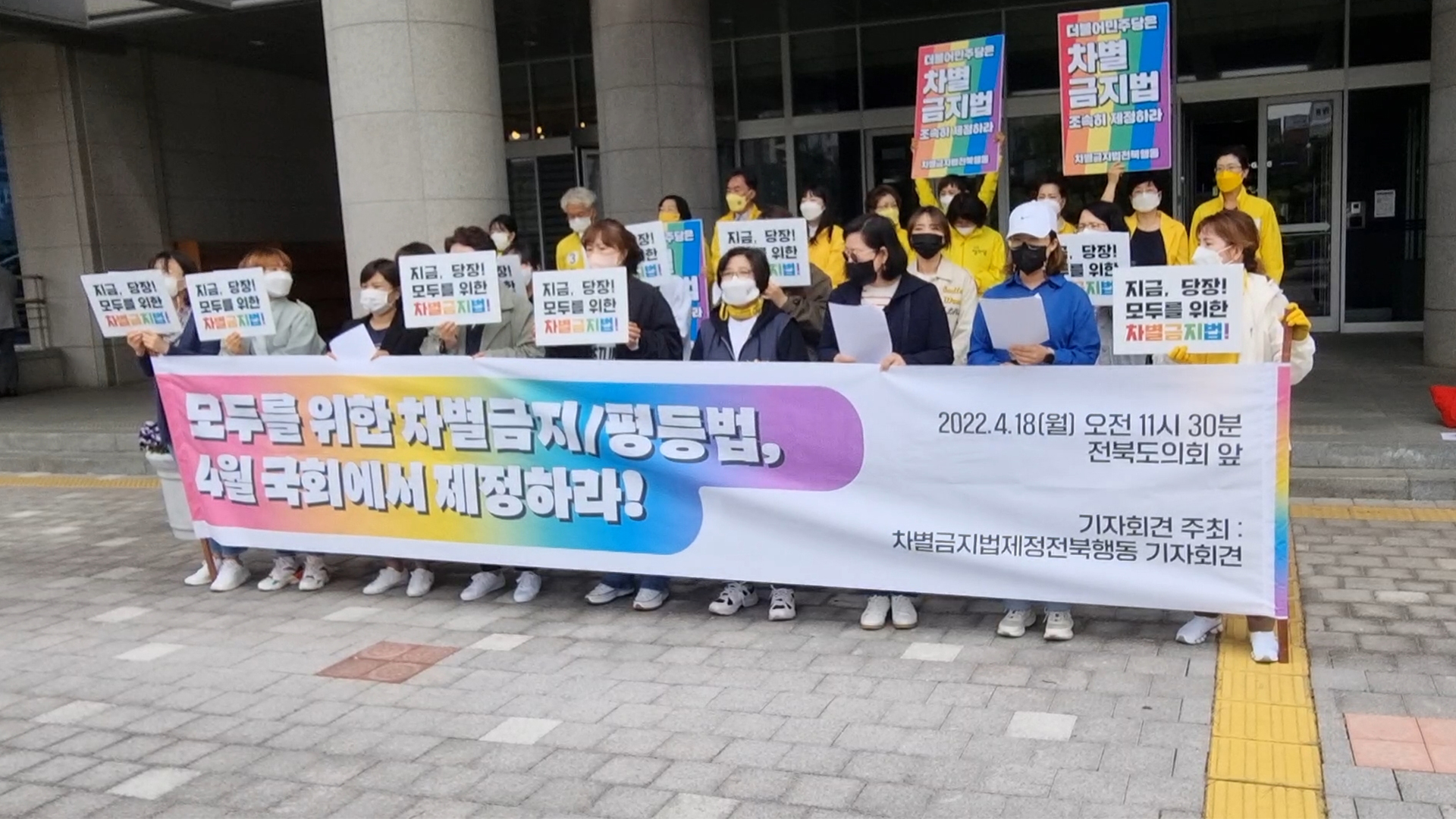 도내 시민단체들이 차별금지법 제정을 촉구하고 나섰습니다.차별금지법 제정 전북행동은 오늘 도의회 앞에서 기자 회견을 열고 국민 10만 명이 참여한 차별금지법 제정 청원에도 국회는 무책임으로 일관하고 있고, 차기...