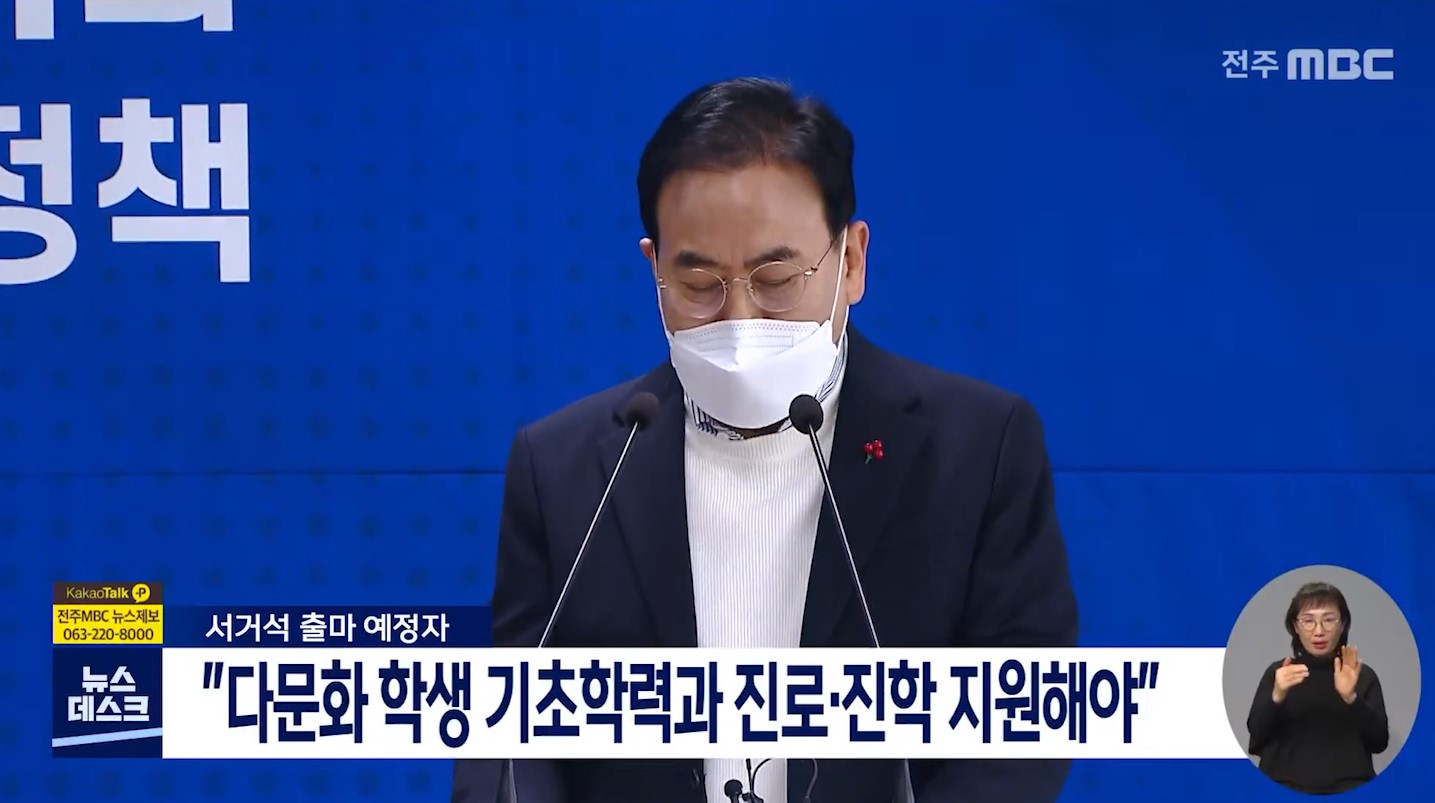 교육감 출마 예정자인 서거석 전 전북대총장이 다문화 학생들을 위한 정책 추진을 제안했습니다.서 전 총장은 오늘 기자회견을 열고, 도내 다문화 학생 비율은 4.2%로 전국 평균의 1.5배에 달한다며, 우리말 교...