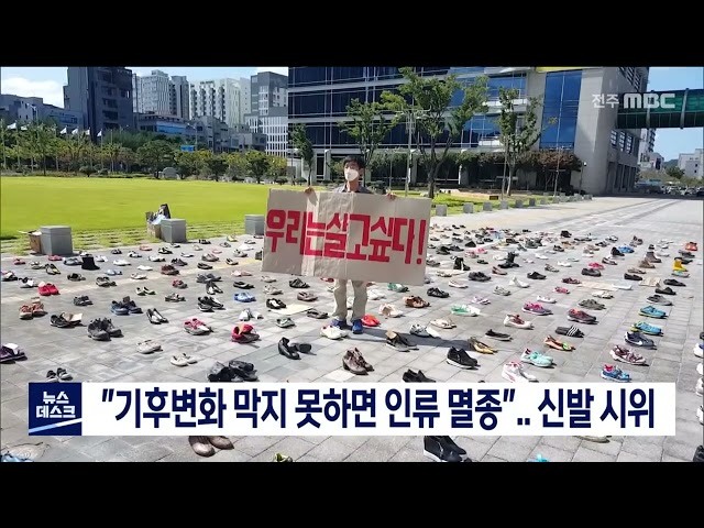 급속도로 진행되는 기후변화를 시급히막아야 한다는 비대면 시위가 열렸습니다. 기후위기 전북비상행동은 '세계 청소년 기후정의를 위한 행동의 날'을 맞아 도청에서 도민 580여 명이 보내온 신발을 전시하고 전라북도...