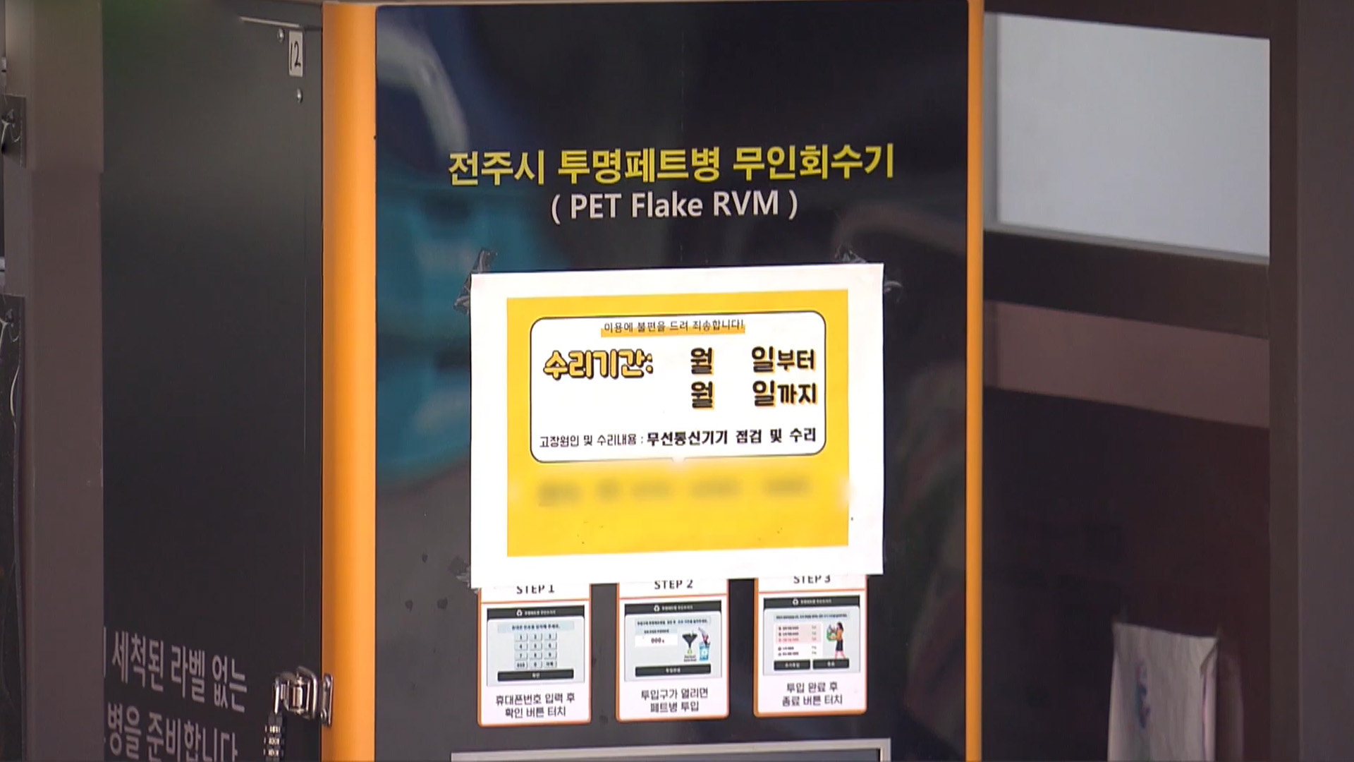 전주시가 7억여 원을 투입한 투명페트병 무인 회수기가 설치만 해놓고 사실상 방치되고 있다는 지적이 나왔습니다.전주시의회 최서연 의원은 투명폐트병 무인회수기 40여대가 전주시내에 설치됐지만, 고장 횟수가 기계당...