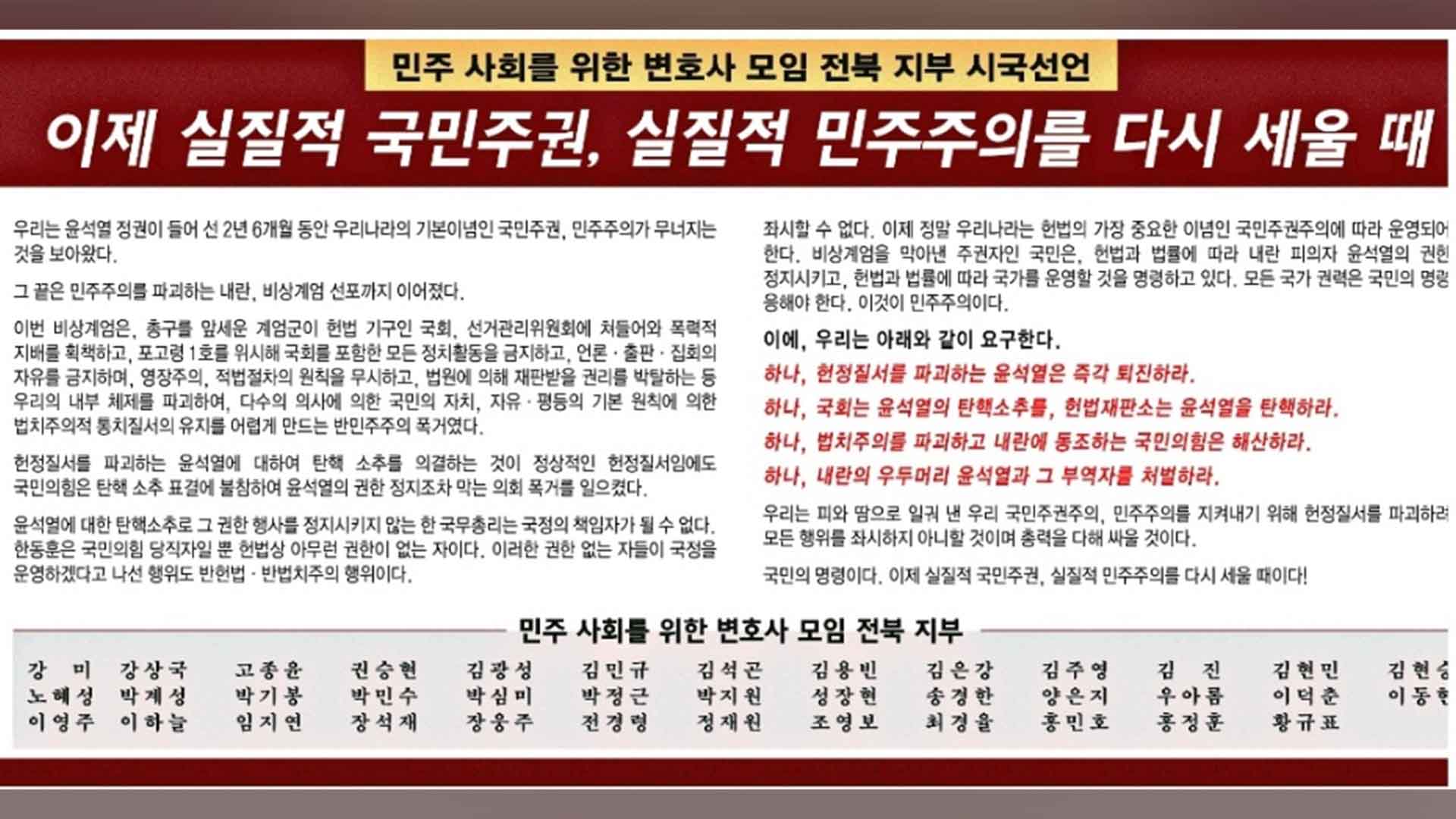 윤석열 대통령의 비상계엄 선포와 관련해 법조인들이 시국선언에 나섰습니다.민주사회를 위한 변호사모임 전북지부는 소속 변호사 38명 명의의 시국선언문을 발표하고, 비상계엄은 법치주의적 통치 질서 유지를 어렵게 만...