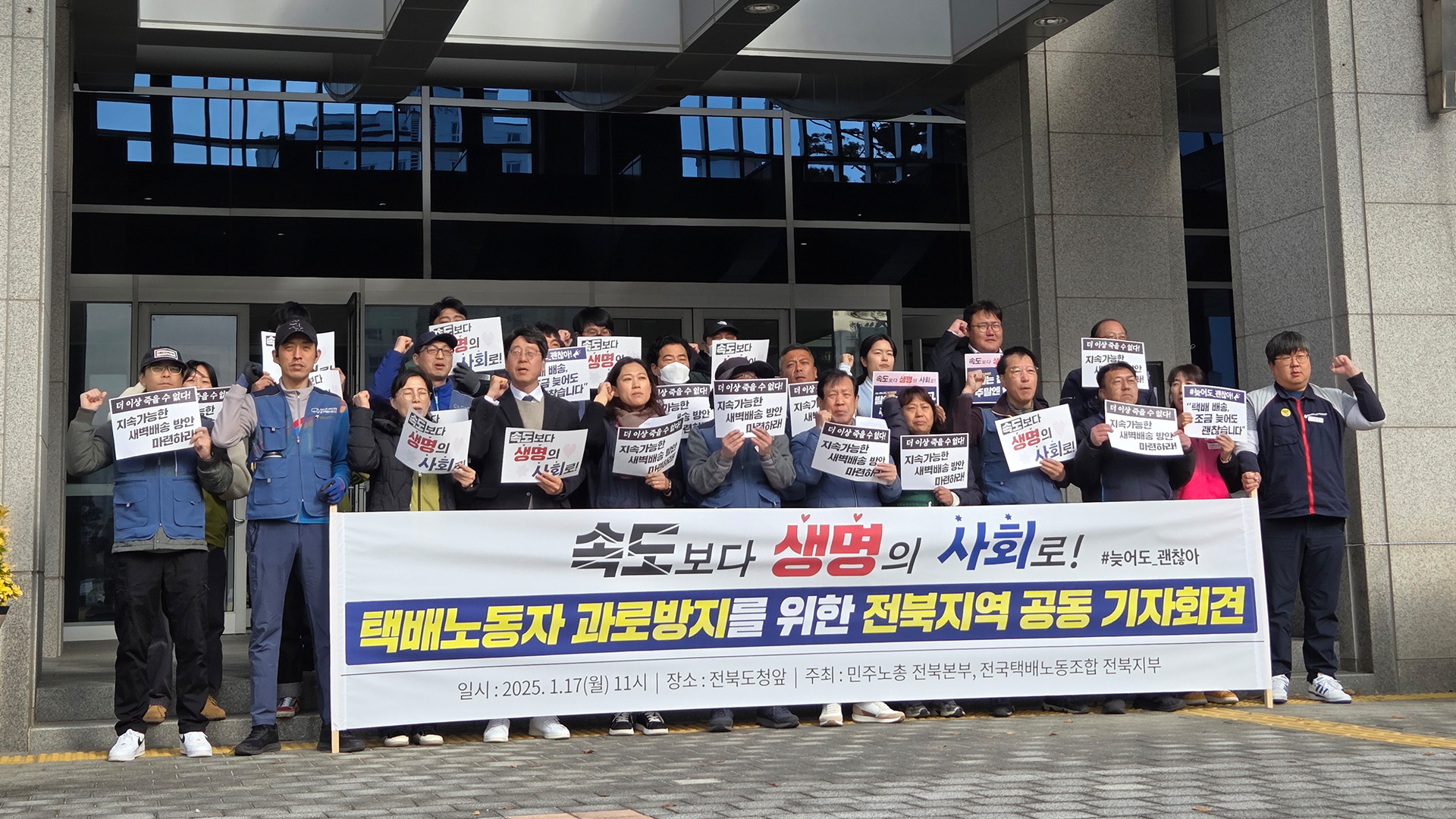 새벽과 휴일까지 이어지는 과도한 택배 경쟁 탓에 노동자들의 과로가 심화되고 있다는 주장이 나왔습니다.전국택배노동조합 전북지부 등은 오늘(17일) 전북도청 앞에서 기자회견을 열고, 택배사의 과도한 경쟁으로 노동...