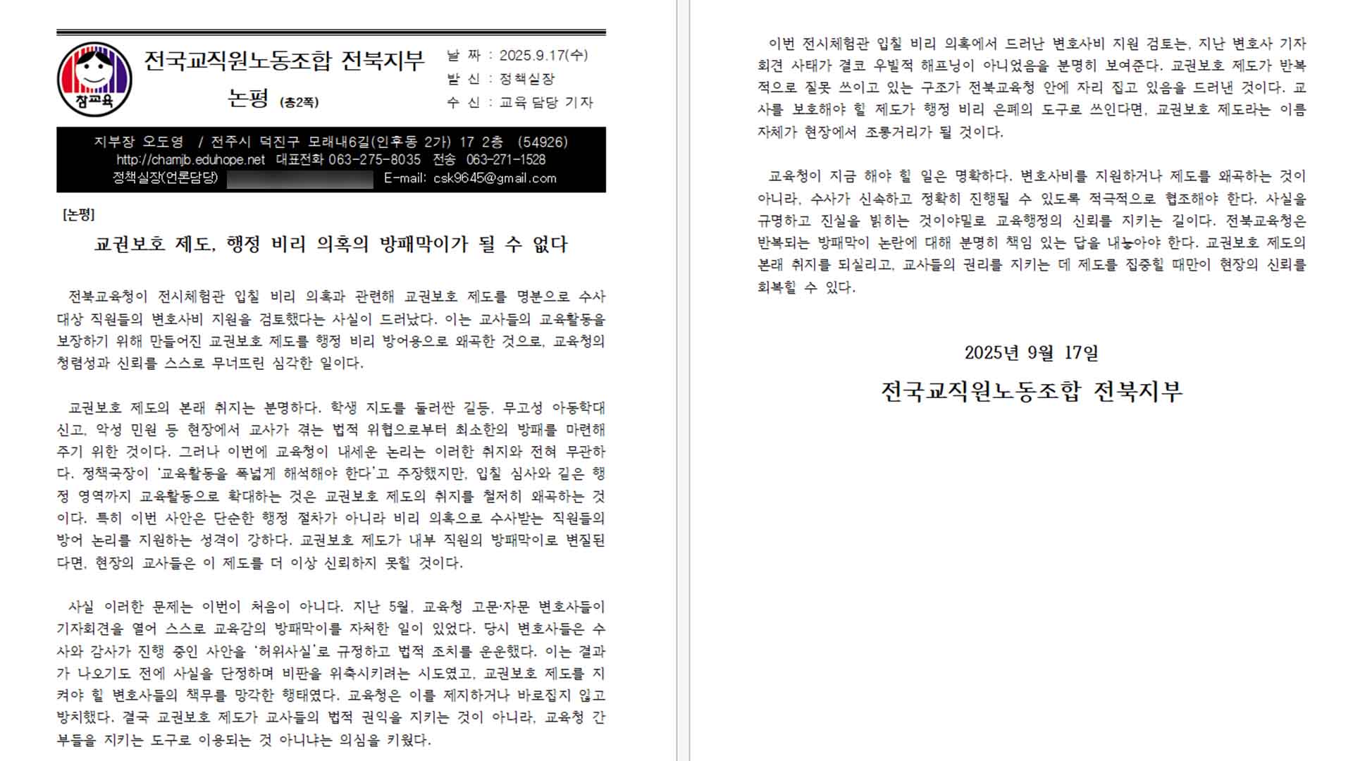 입찰 비리 의혹 수사 대상자들에게 변호사비 지원을 검토한 전북교육청에 비판이 이어졌습니다.전국교직원노동조합 전북지부는 오늘(17일) 논평을 내고 현장 교사의 보호를 위한 교권보호 제도를, 비리 의혹 수사를 받...