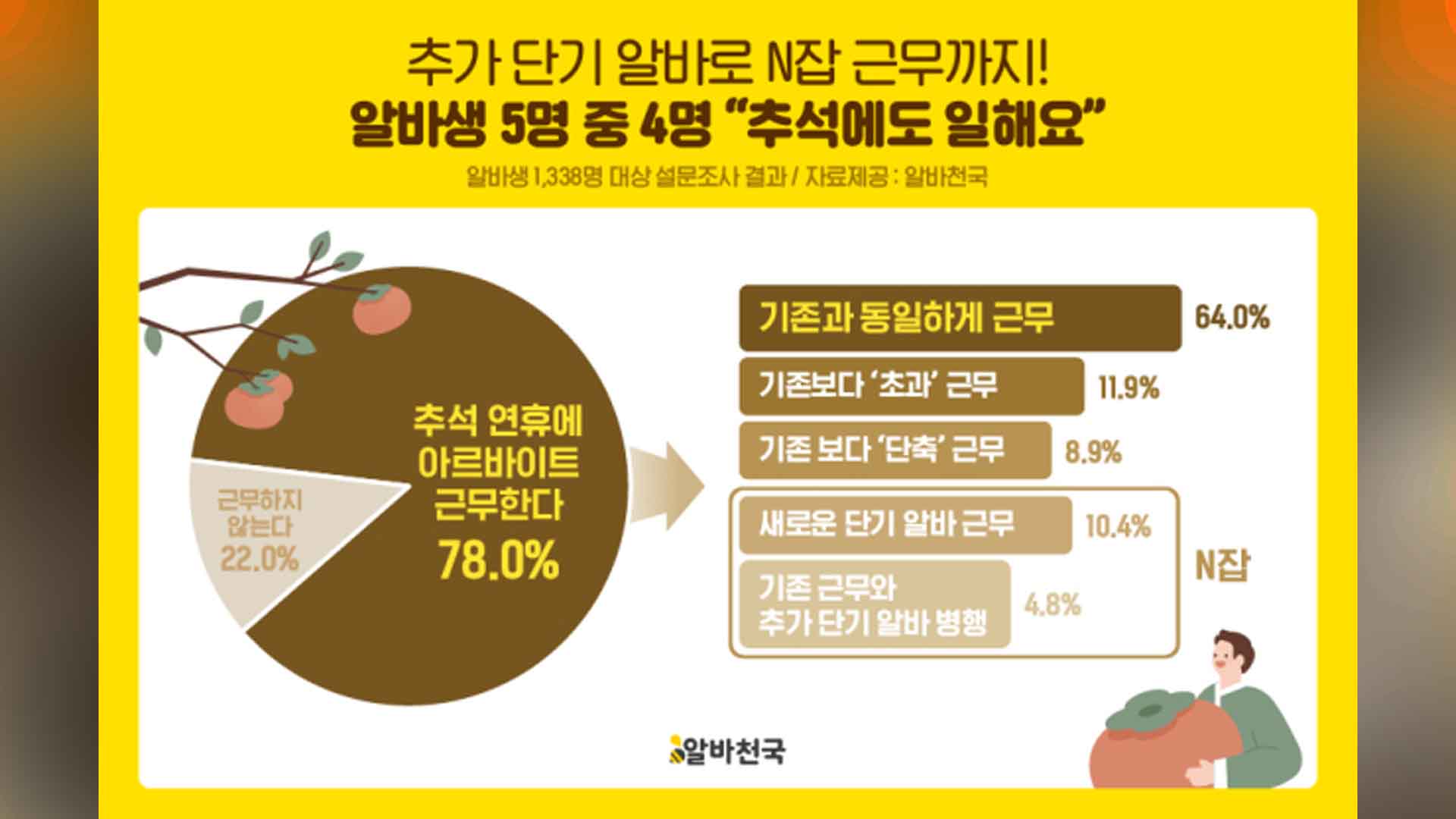 아르바이트생 5명 중 4명이 추석 연휴 기간에도 근무를 하는 것으로 조사됐습니다.‘알바천국’은 알바생 1338명을 대상으로 조사한 결과,1043명, 78%가 추석 연휴에도 근무를 하는 것으로 집계됐다고 오늘(...